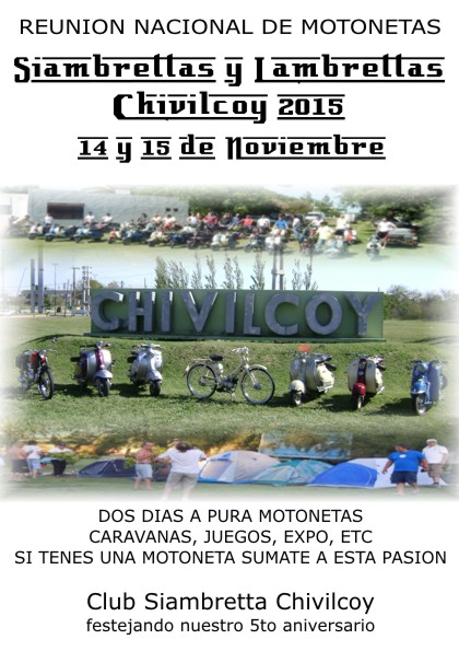 El fin de semana del 14 y 15 de Noviembre, el Club Siambretta Chivicoy festeja su 5to. Aniversario con un Encuentro de Siambrettas en la mencionada localidad. El CSBA como no podía ser de otra manera dirá presente para agasajar a los amigos de Chivilcoy.