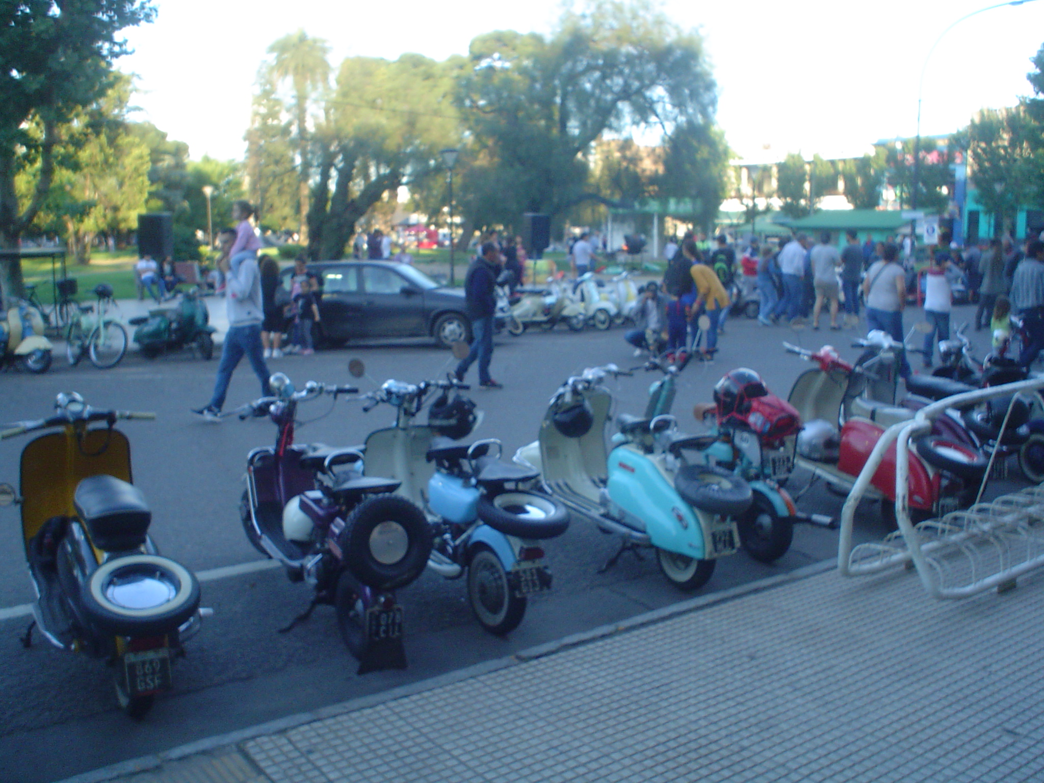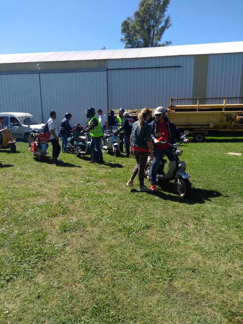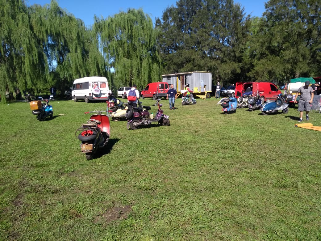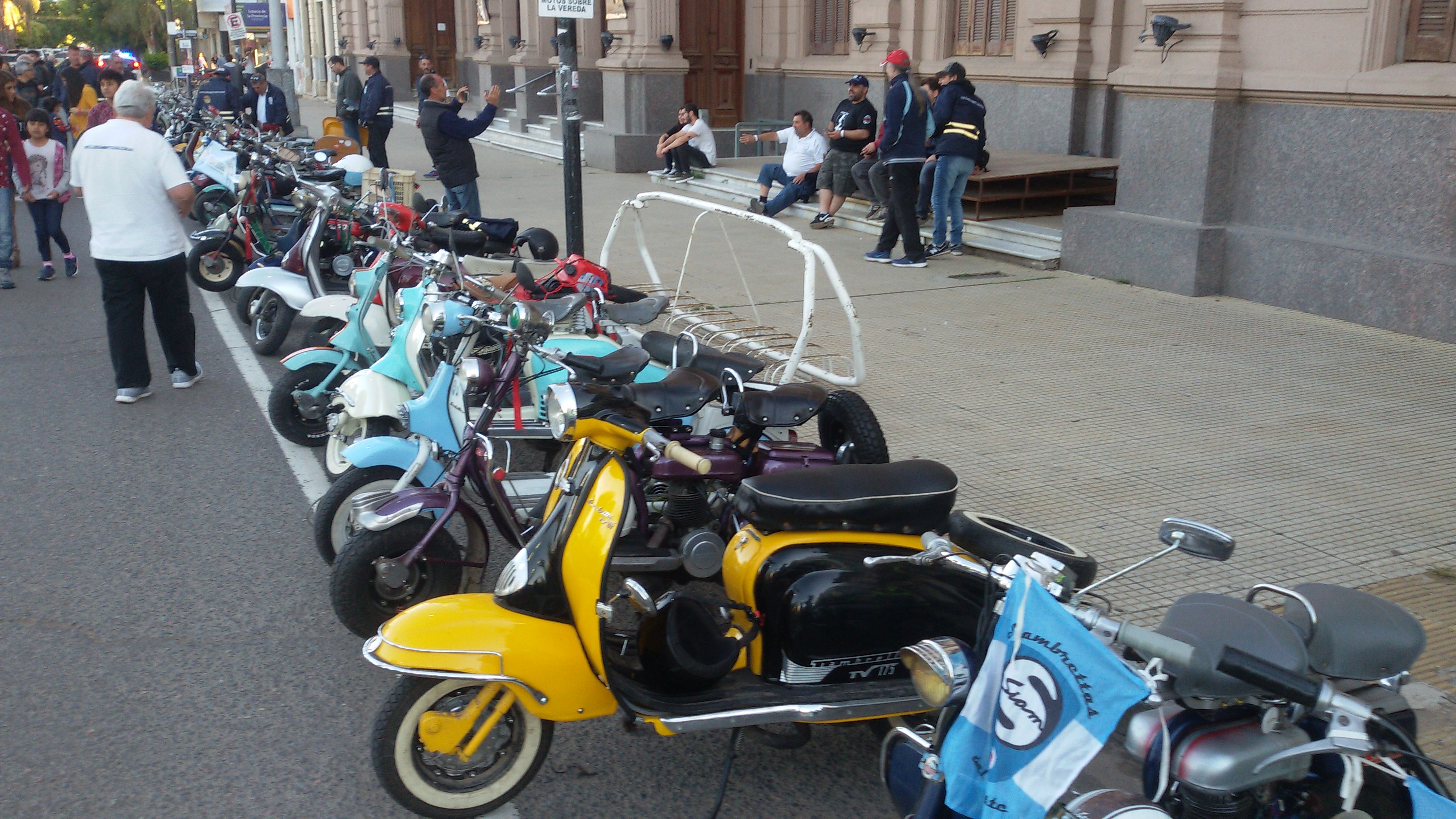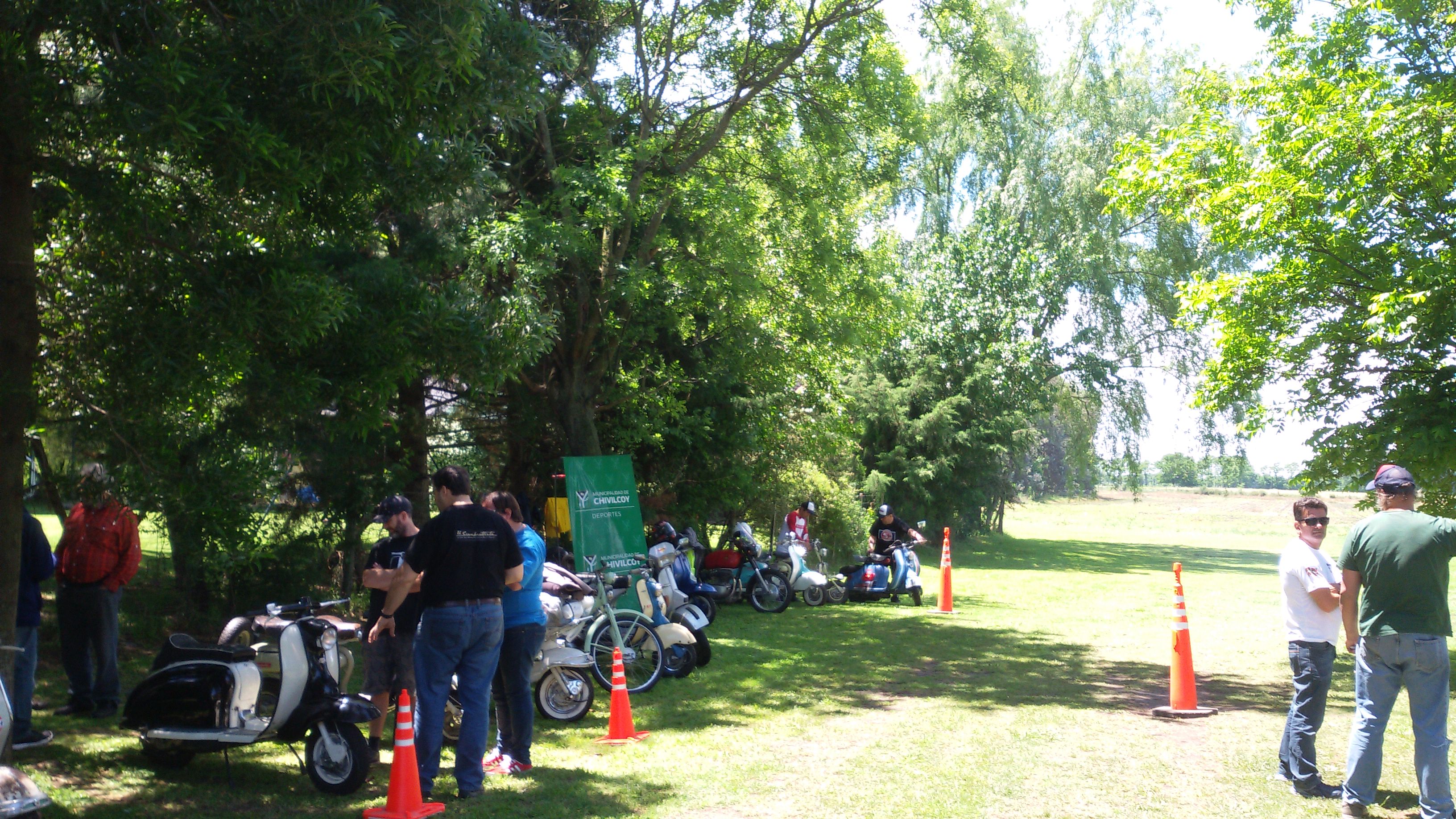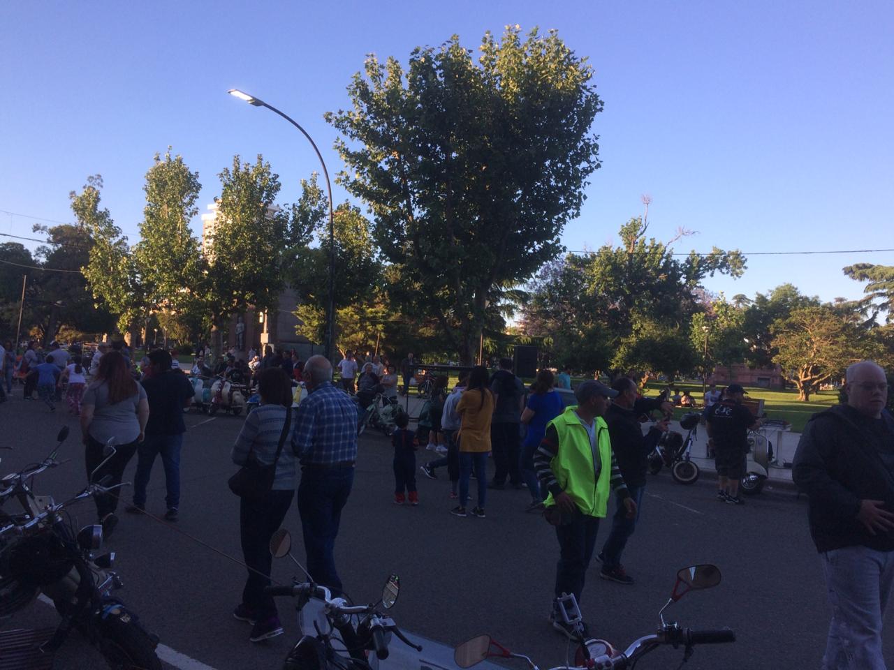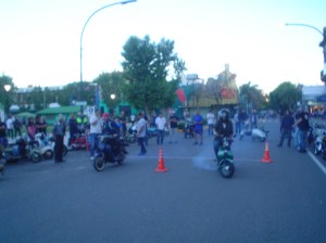 Almorzamos en la cantina muy bien atendida por los muchachos del CSCH, teníamos un rato para acomodarnos, armar las carpas y sacar fotos. A las 18 partíamos en caravana al centro de la ciudad, donde frente a la plaza se hacía la exposición estática de las motonetas y las pruebas de destreza, también llamadas carreras lentas.