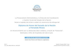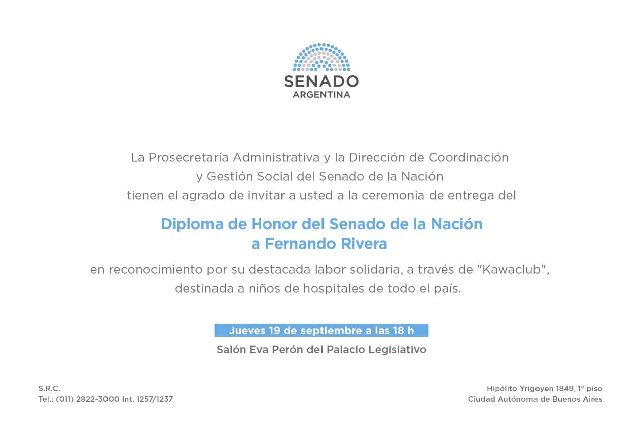 En el día de la fecha, 19 de Septiembre, el Senado de la Nación distinguirá a Fernando Rivera del Kawaclub, por su labor solidaria y ser el gestor de la Caravana que todos los años lleva juguetes a los Hospitales Garraham, Gutiérrez y Elizalde