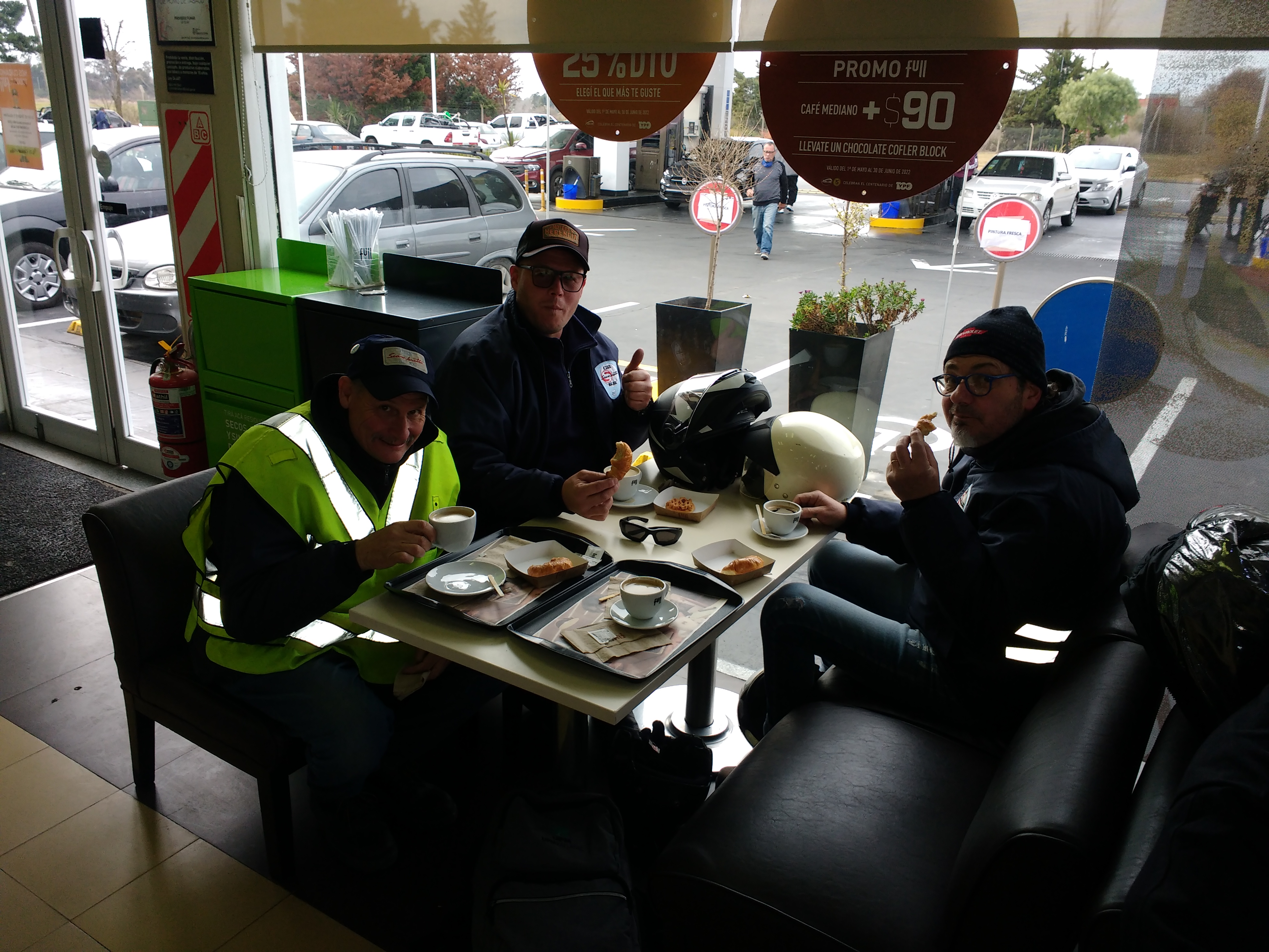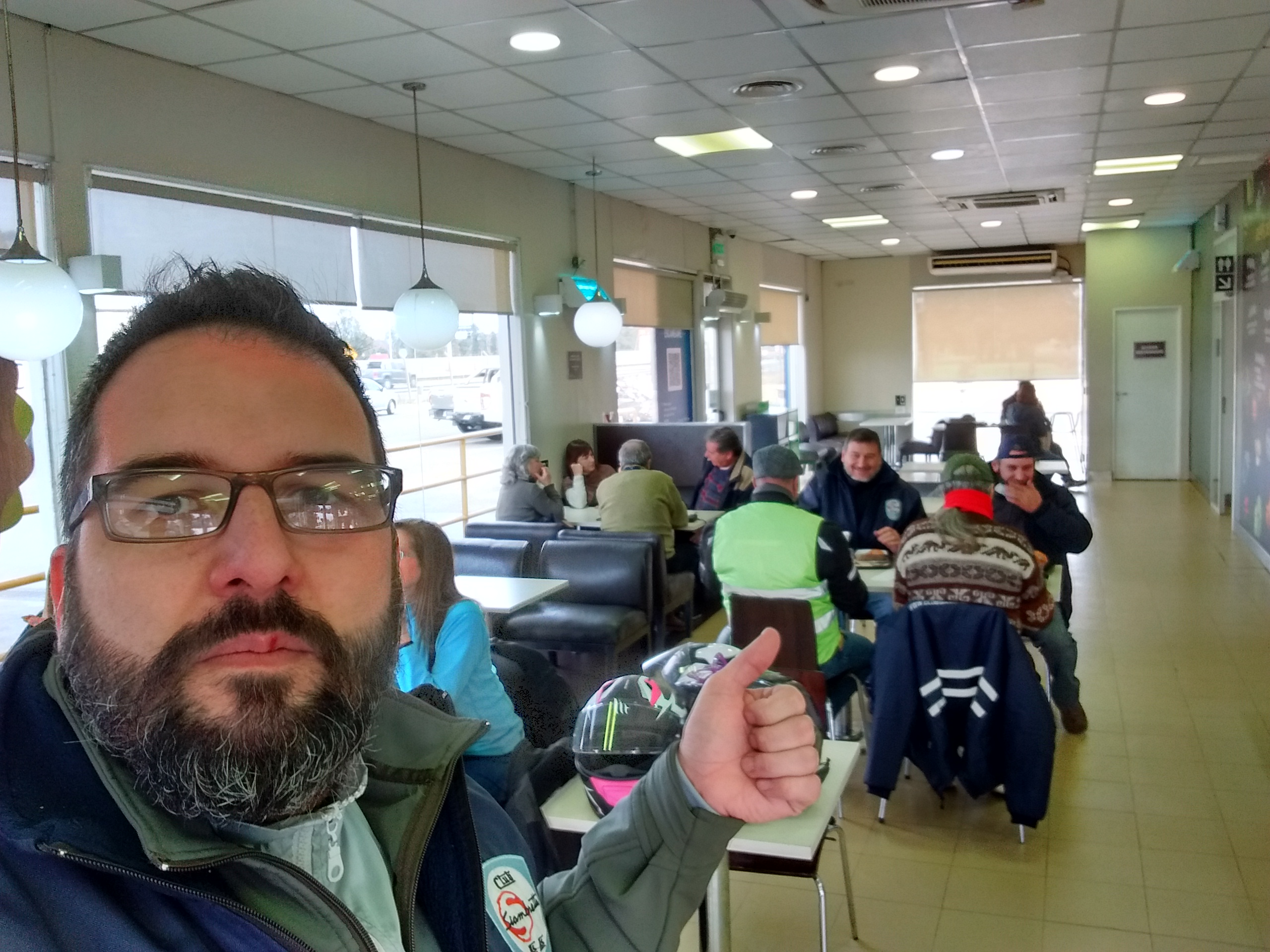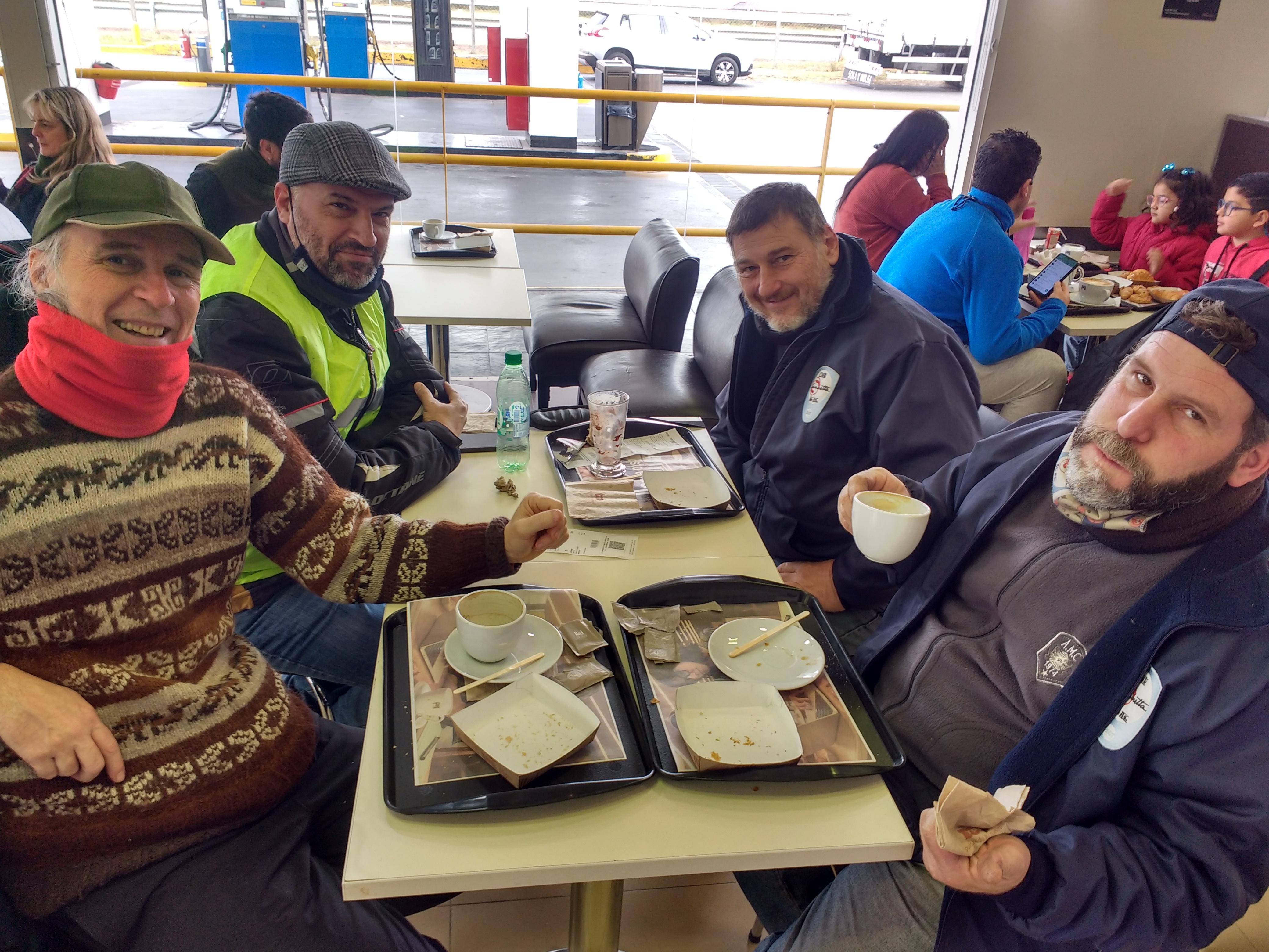 Nos juntamos a las 10.30 hs esperando que el Solcito elevara un poco la temperatura, cosa que no paso. Como ya es habitual cuando rumbeamos por el acceso, pusimos un punto de encuentro y luego nos dirigimos a la estación de servicio a desayunar.